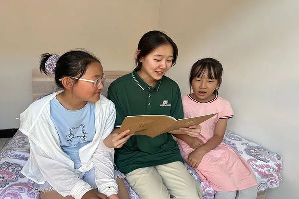 7月13日,团队成员走进牧民家中,为孩子们带去知识与欢乐。针对暑假作业中的难点,团队成员耐心讲解、指导语文写作,引导孩子们逐步构建语言表达框架,帮助他们巩固知识。为了增强学习的趣味性,团队精心设计了“拼音大闯关”“古诗接龙”等互动游戏。在欢笑声中,孩子们通过卡片配对、情景对话等方式巩固拼音知识,激发了孩子们学习普通话的兴趣。当读到《敕勒歌》中“天苍苍,野茫茫”的诗句时,孩子们情不自禁地跟着节奏拍手朗诵。团队成员用普通话生动讲述了《狼图腾》《敖包相会》等草原传说和童话故事,勾勒出了一幅幅神秘而又美好的草原画面,孩子们听得津津有味。通过结合动画短片、绘本插图的形式,孩子们在语言学习中传递文化温度。一个小女孩紧紧拉着团队成员的手,满是憧憬地说:“哥哥姐姐讲的故事真好听,我以后一定要用普通话把我们的草原故事讲给更多人听!”