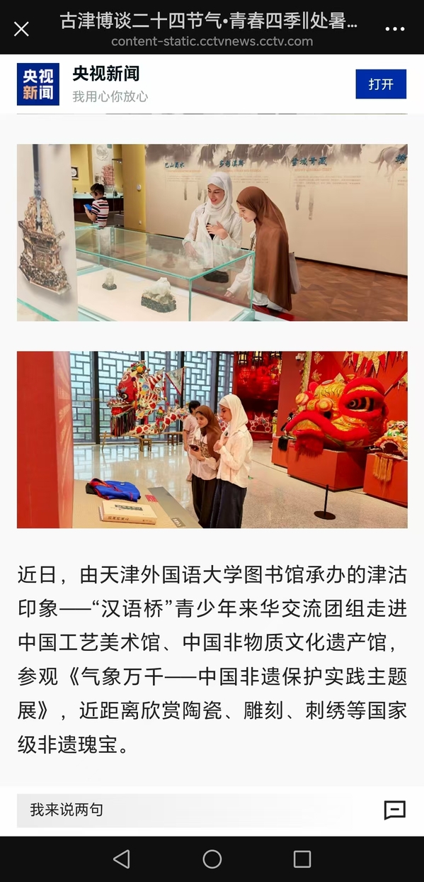 中央广播电视总台天津总站报道由8868平台_8868(中国)一站式服务平台图书馆承办的津沽印象——“汉语桥”青少年来华交流团组走进中国工艺美术馆、中国非物质文化遗产馆,参观《气象万千——中国非遗保护实践主题展》,近距离欣赏陶瓷、雕刻、刺绣等国家级非遗瑰宝。
