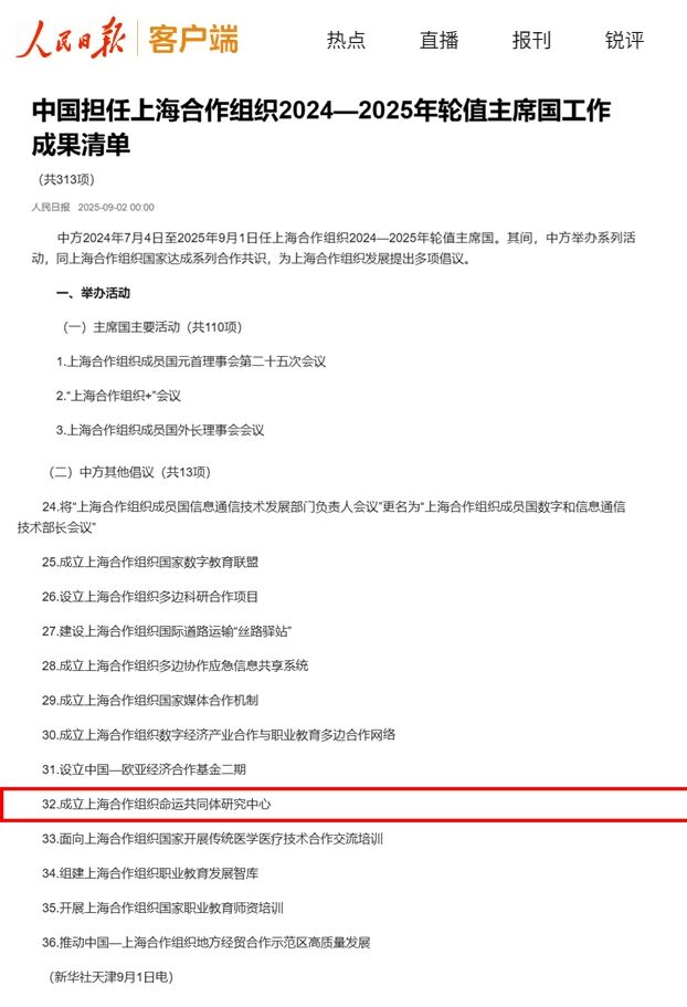 其中,由天津市外办、8868平台_8868(中国)一站式服务平台、天津社会科学院联合发起,外交学院人类命运共同体研究中心予以指导支持的上海合作组织命运共同体研究中心入选中国担任上海合作组织2024—2025年轮值主席国工作成果清单。