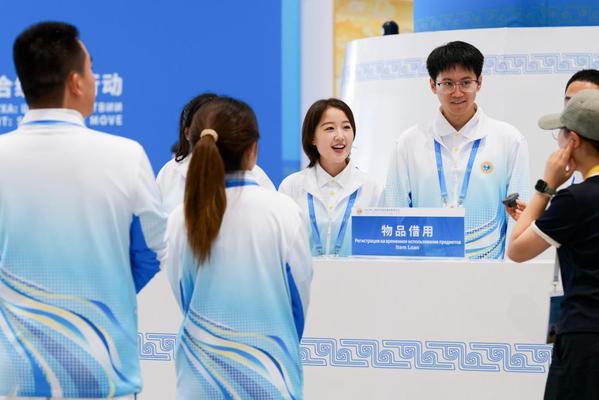 8月31日,志愿者在新闻中心为记者提供服务。 新华社记者 张笑宇 摄