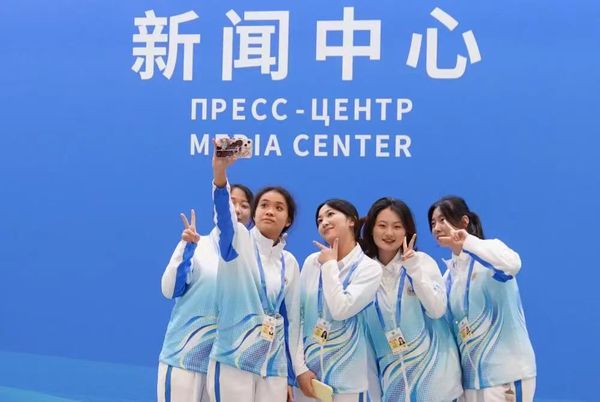 8月30日,志愿者在2025年上海合作组织峰会新闻中心合影。 新华社