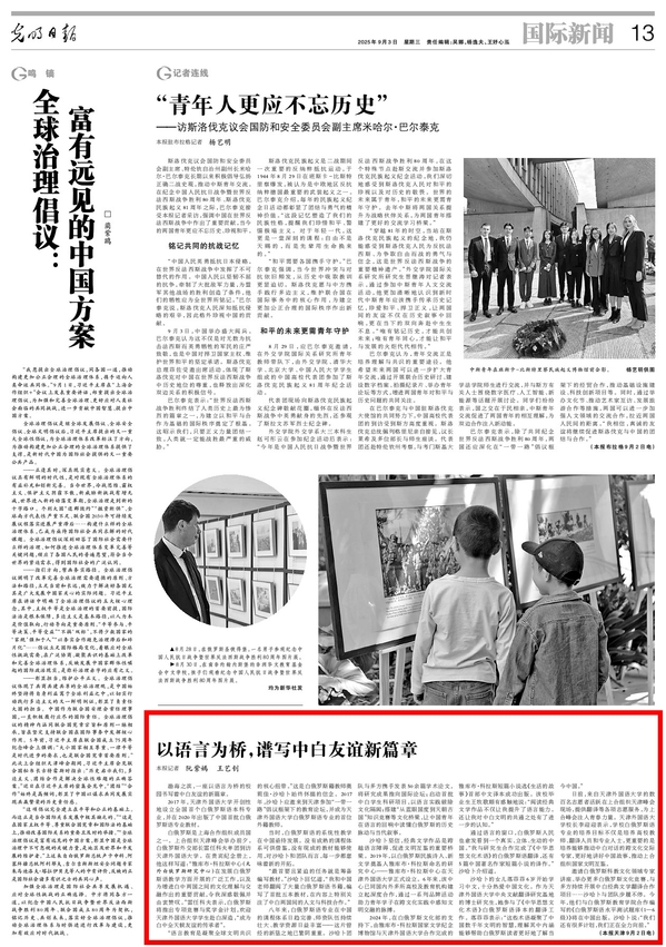 【相约上合】上合组织峰会召开之际,《光明日报》国际新闻版报道我校2017年开创性地设立全国首个白俄罗斯语本科专业,并在2020年出版了中国首批白俄罗斯语专业教材。上合峰会前夕,白俄罗斯外长到访我校;峰会期间,天外数百名志愿者活跃在上合组织天津峰会现场,提供翻译等各项志愿服务,为上合峰会注入青春力量。