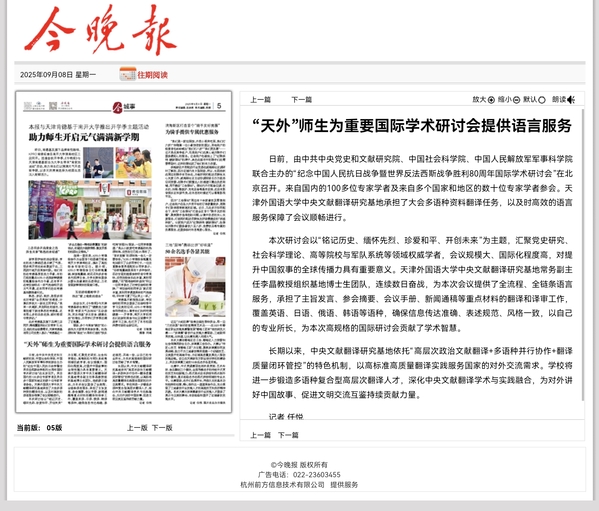 【媒体天外】《今晚报》报道由中共中央党史和文献研究院、中国社会科学院、中国人民解放军军事科学院联合主办的“纪念中国人民抗日战争暨世界反法西斯战争胜利80周年国际学术研讨会”在北京召开。8868平台_8868(中国)一站式服务平台中央文献翻译研究基地承担了大会多语种资料翻译任务,以及时高效的语言服务保障了会议顺畅进行。