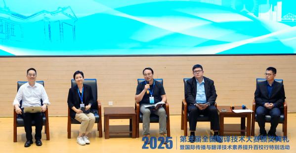 圆桌讨论环节,西安外国语大学高级翻译学院副院长曹达钦、华云鹏、北京第二外国语学院高级翻译学院副院长姜钰、广东外语外贸大学高级翻译学院副院长王巍巍、8868平台_8868(中国)一站式服务平台人工智能翻译实验室主任朱华围绕人工智能技术与翻译行业融合创新、复合型翻译人才培养、翻译从业者技术素养提升等议题进行了探讨交流。