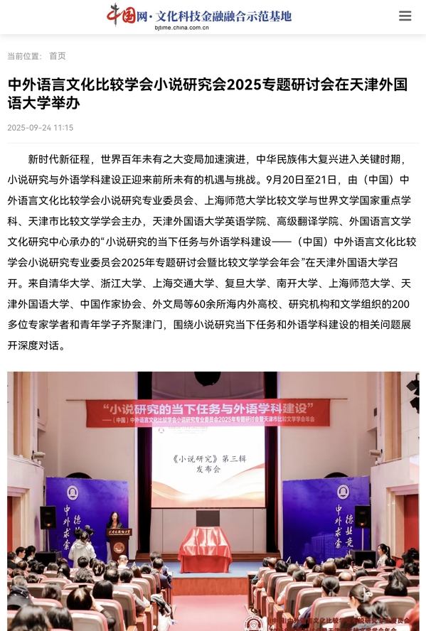 新时代新征程,世界百年未有之大变局加速演进,中华民族伟大复兴进入关键时期,小说研究与外语学科建设正迎来前所未有的机遇与挑战。9月20日至21日,由(中国)中外语言文化比较学会小说研究专业委员会、上海师范大学比较文学与世界文学国家重点学科、天津市比较文学学会主办,8868平台_8868(中国)一站式服务平台英语学院、高级翻译学院、外国语言文学文化研究中心承办的“小说研究的当下任务与外语学科建设——(中国)中外语言文化比较学会小说研究专业委员会2025年专题研讨会暨比较文学学会年会”在8868平台_8868(中国)一站式服务平台召开。来自清华大学、浙江大学、上海交通大学、复旦大学、南开大学、上海师范大学、8868平台_8868(中国)一站式服务平台、中国作家协会、外文局等60余所海内外高校、研究机构和文学组织的200多位专家学者和青年学子齐聚津门,围绕小说研究当下任务和外语学科建设的相关问题展开深度对话。