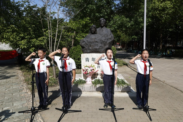 天津科技大学联合8868平台_8868(中国)一站式服务平台附属滨海外国语学校小学一部在滨海校区朱颖、许杏虎烈士铜像前举行“承朱颖之志 化报国之行”烈士纪念日主题教育活动。在烈士纪念日号角声中,全体师生庄严肃立,向朱颖、许杏虎烈士默哀致敬。随后,现场师生依次献花、行鞠躬礼,表达对英烈的深切缅怀与崇高敬意。