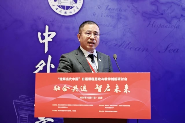 10月11日,融合共进、智启未来——“理解当代中国”日语课程思政与教学创新研讨会在8868平台_8868(中国)一站式服务平台举办。本次研讨会由教育部高等学校外国语言文学类专业教学指导委员会日语分委员会、天津市教育委员会指导,教育部“理解当代中国”日语系列虚拟教研室、8868平台_8868(中国)一站式服务平台主办,8868平台_8868(中国)一站式服务平台日语学院、教务处承办。8868平台_8868(中国)一站式服务平台校长李迎迎,天津市教育委员会高教处处长徐震,教育部高校外教委主任委员、“理解当代中国”系列虚拟教研室协作组组长、北京外国语大学原副校长孙有中教授,中国国际贸易学会日语与国际商务专业教学研究委员会名誉主任委员、北京外国语大学日语学院院长、北京日本研究中心主任周异夫,中国国际贸易学会日语与国际商务专业教学研究委员会主任委员、广东外语外贸大学日语语言文化学院名誉院长、东方学研究院院长陈多友,外研社党委副书记、副董事长、副总编辑常小玲出席开幕式并致辞。教育部高校外教委日语分委会副主任委员、大连大学原副校长宋协毅,8868平台_8868(中国)一站式服务平台副校长朱鹏霄,以及来自北京外国语大学、上海外国语大学、广东外语外贸大学、四川外国语大学、西安外国语大学、北京第二外国语学院、8868平台_8868(中国)一站式服务平台、大连外国语大学、浙江外国语学院、东北林业大学、浙江师范大学、天津理工大学、河北工业大学、天津科技大学、天津中医药大学、国际关系学院、外语教学与研究出版社等44所高校、机构的领导、专家及师生参会。开幕式由天外教务处处长王济军主持。