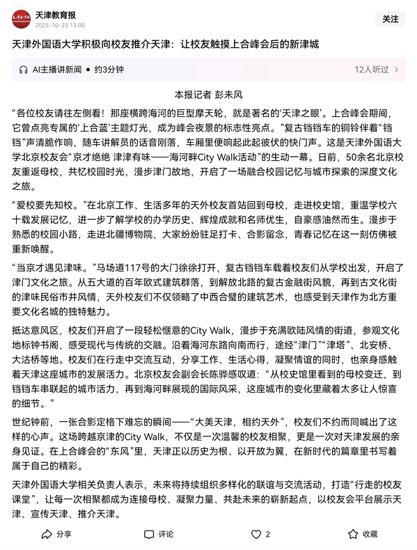 世纪钟前,一张合影定格下难忘的瞬间——“大美天津,相约天外”,校友们不约而同喊出了这样的心声。这场跨越京津的City Walk,不仅是一次温馨的校友相聚,更是一次对天津发展的亲身见证。在上合峰会的“东风”里,天津正以历史为根、以开放为翼,在新时代的篇章里书写着属于自己的精彩。
