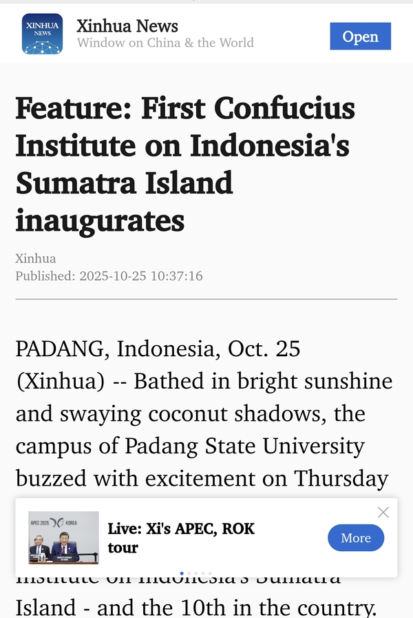 PADANG, Indonesia, Oct. 25 (Xinhua) -- Bathed in bright sunshine and swaying coconut shadows, the campus of Padang State University buzzed with excitement on Thursday as guests gathered to celebrate the inauguration of the first Confucius Institute on Indonesia's Sumatra Island - and the 10th in the country.