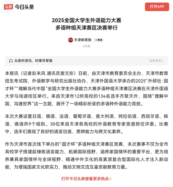 作为天津市首次线下举办的“国才杯”多语种组天津赛区竞赛,本次赛事不仅为全市高校学子搭建起锤炼语言能力、拓展国际视野、涵养家国情怀的重要平台,更为培养兼具家国情怀与全球视野、精通中外文化的高素质复合型国际化人才注入新动能,为增强国家文化软实力、推动文明交流互鉴贡献教育力量。