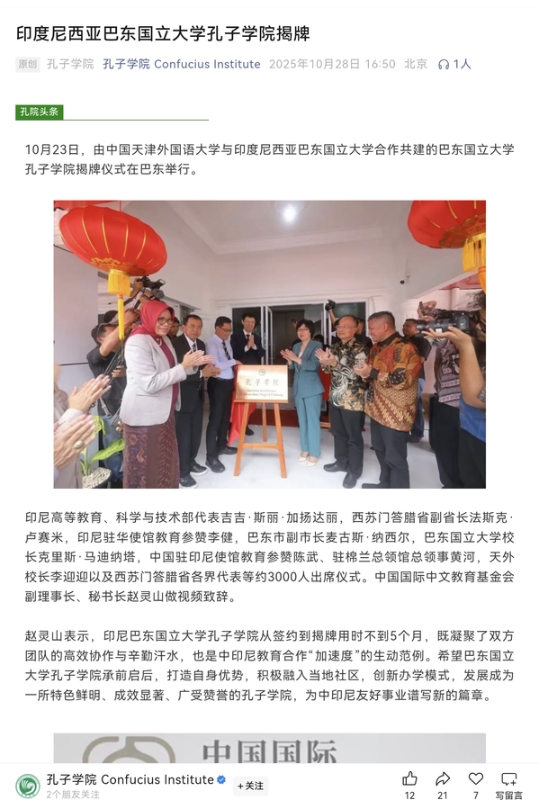 赵灵山表示,印尼巴东国立大学孔子学院从签约到揭牌用时不到5个月,既凝聚了双方团队的高效协作与辛勤汗水,也是中印尼教育合作“加速度”的生动范例。希望巴东国立大学孔子学院承前启后,打造自身优势,积极融入当地社区,创新办学模式,发展成为一所特色鲜明、成效显著、广受赞誉的孔子学院,为中印尼友好事业谱写新的篇章。