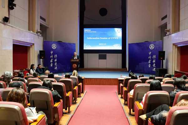 会见结束后,迪米塔尔·迪米特罗夫以“教育无国界:国际合作与未来愿景”为题,与我校国际商学院中保合作项目学生进行交流,详细梳理了教育国际交流合作的历史渊源、现状及未来发展方向,分享教育国际交流与合作的跨文化理解与理念,与会学生反响热烈。
