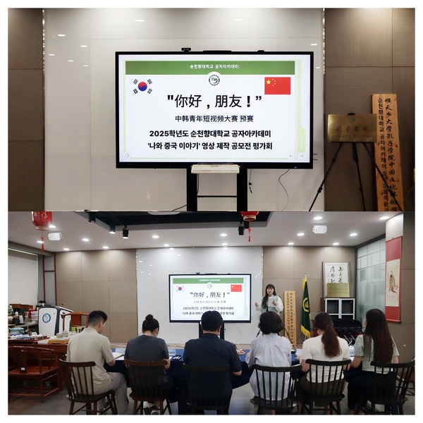 为积极响应中华人民共和国驻韩国大使馆发起的“你好,朋友!”中韩青年短视频大赛,顺天乡大学孔子学院今日举办了“你好,朋友!”中韩青年视频大赛预赛评选大会,为为期三个月的作品征集阶段画上圆满句号。本次孔院短视频征集自2025年4月启动以来,吸引了顺天乡大学及下设孔子课堂的众多青年学子踊跃参与。参赛学生通过镜头讲述自己与中国语言文化的邂逅与成长,展现了当代韩国青年对中国文化的理解、兴趣与情感共鸣。经过严格评审,最终评选出两项一等奖和一项二等奖,优秀作品将代表孔子学院参加中国驻韩大使馆主办的中韩青年视频大赛。在本次获奖的视频作品中,学生们以自身的中文学习经历为切入点,生动讲述了与中国语言和文化结缘的点