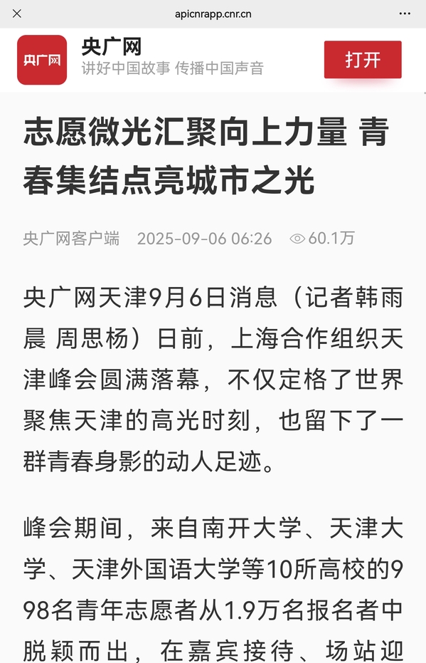 【媒体天外】天津日报、津云报道高校开学新举措。其中,报道我校将新生入学教育从“开学后的集中培训”向“报到前的主动融入”的转变,以重大历史时刻为鲜活思政教育素材,以校园文化与历史传承为根基,通过组织新生代表观看纪念中国人民抗日战争暨世界反法西斯战争胜利80周年大会等,前置性进行爱国主义教育,引导学生将国家叙事、民族记忆与个体成长深度融合。全文转载如下:9月6日,南开大学、天津大学、天津科技大学、天津城建大学、天津音乐学院、天津市大学软件学院等多所高校新生报到,大学校园里彩旗飘扬,学长学姐志愿者们举着院系牌热情引路,新生和家长提着行李穿梭其间,各式各样的迎新活动仪式感满满,让学子们在学校的暖心和热