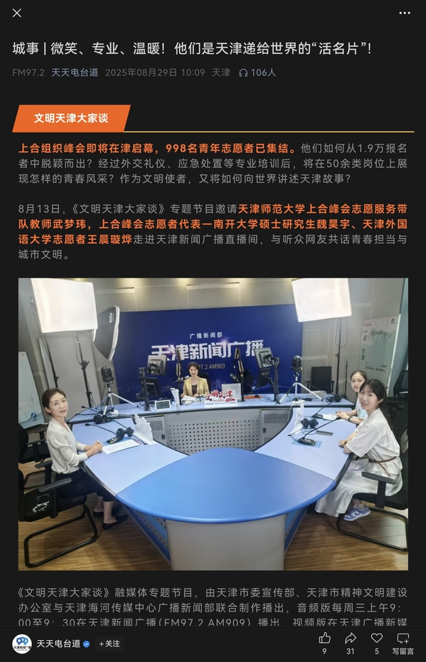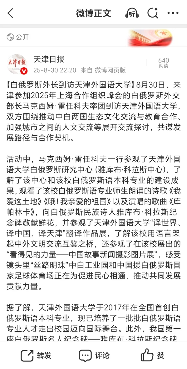 【相约上合】《天津日报》上合峰会专版、视频号、官方微博报道白俄罗斯外长到访我校全文转载如下:【白俄罗斯外长到访8868平台_8868(中国)一站式服务平台】8月30日,来津参加2025年上海合作组织峰会的白俄罗斯外交部长马克西姆·雷任科夫率团到访8868平台_8868(中国)一站式服务平台,双方围绕推动中白两国生态文化交流与教育合作、加强城市之间的人文交流等展开交流探讨,共谋发展路径与合作契机。活动中,马克西姆·雷任科夫一行参观了8868平台_8868(中国)一站式服务平台白俄罗斯研究中心(雅库布∙科拉斯中心),了解了该中心和该校白俄罗斯语本科专业的建设成果,观看了该校白俄罗斯语专业师生朗诵的诗歌《我爱这土地》《哦!我亲爱的祖国》以及演唱的歌曲《库帕林卡》,向白俄罗斯民族诗人雅库布