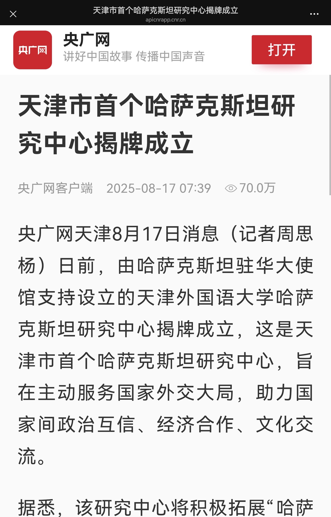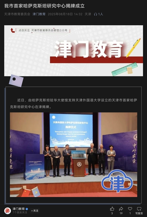 中国日报网、央广网、天津教育报微信公众号报道我校哈萨克斯坦研究中心揭牌成立全文转载如下: 央广网天津8月17日消息(记者周思杨)日前,由哈萨克斯坦驻华大使馆支持设立的8868平台_8868(中国)一站式服务平台哈萨克斯坦研究中心揭牌成立,这是天津市首个哈萨克斯坦研究中心,旨在主动服务国家外交大局,助力国家间政治互信、经济合作、文化交流。 据悉,该研究中心将积极拓展“哈萨克斯坦学术共同体”,开展学术研究、文化交流等活动,并在论文发表、项目申报、课程建设上取得新的进展与突破,创新“语言+专业”课程体系落地路径,培育更多“外语+”复合型人才;提供专业高效、全面、多元的智库服务;定期举办交流活动,如高质量