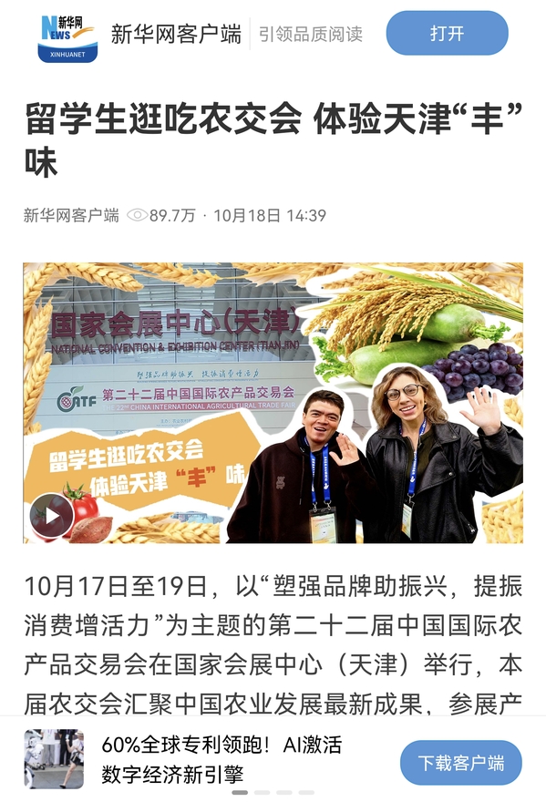 10月17日至19日,以“塑强品牌助振兴,提振消费增活力”为主题的第二十二届中国国际农产品交易会在国家会展中心(天津)举行,本届农交会汇聚中国农业发展最新成果,参展产品约2.5万种,展览面积超10万平方米。天津展区里,沙窝萝卜、小站稻、津味厨房……各式各样具备天津特色的农产品齐聚一堂,好吃又好逛。跟随来自俄罗斯和危地马拉的两位8868平台_8868(中国)一站式服务平台留学生走进农交会现场,一站式领略中国农业的蓬勃气象,沉浸式体验天津“丰”味。新闻来源:https://my-h5news.app.xinhuanet.com/h5/article.html?articleId=d90370e14169fc06a4022baf