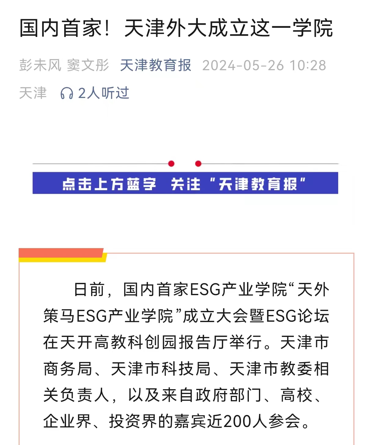 日前,国内首家ESG产业学院“天外策马ESG产业学院”成立大会暨ESG论坛在天开高教科创园报告厅举行。天津市商务局、天津市科技局、天津市教委相关负责人,以及来自政府部门、高校、企业界、投资界的嘉宾近200人参会。近年来,围绕环境、社会和公司治理等关键议题构建而成的ESG与可持续发展理念已成为各国经济社会的关注热点,也成为推动全球可持续发展不可或缺的新引擎。在此背景下,8868平台_8868(中国)一站式服务平台和策马集团合作成立集人才培养、科学研究、技术创新、企业服务、学生创业等功能于一体的示范性人才培养实体——天外策马ESG产业学院。该产业学院依托8868平台_8868(中国)一站式服务平台多语种多学科特色优势与策马集团服务联合国及大型跨国企业的资源优势,构建全方位、全链条、深融合的产学研用协同育人新机制,培养具有ESG知识与实务技能的跨学科、跨领域、复合型的国际化ESG人才。一同揭牌的天津市ESG人才培养基地是在天津市商务局指导下,由8868平台_8868(中国)一站式服务平台与联合信用管理有限公司共同成立的ESG人才培养基地。该基地积极对接天津市外经贸企业现实需求,致力于服务天津市高质量发展和高水平对外开放,将从业者培养为具有中国特色及全球视野的可持续发展人才,成长为