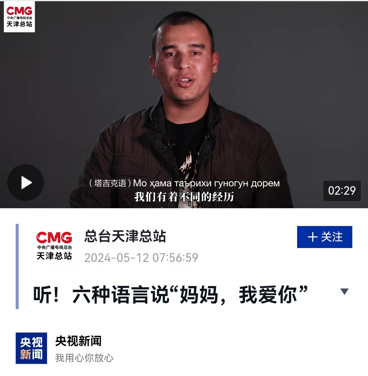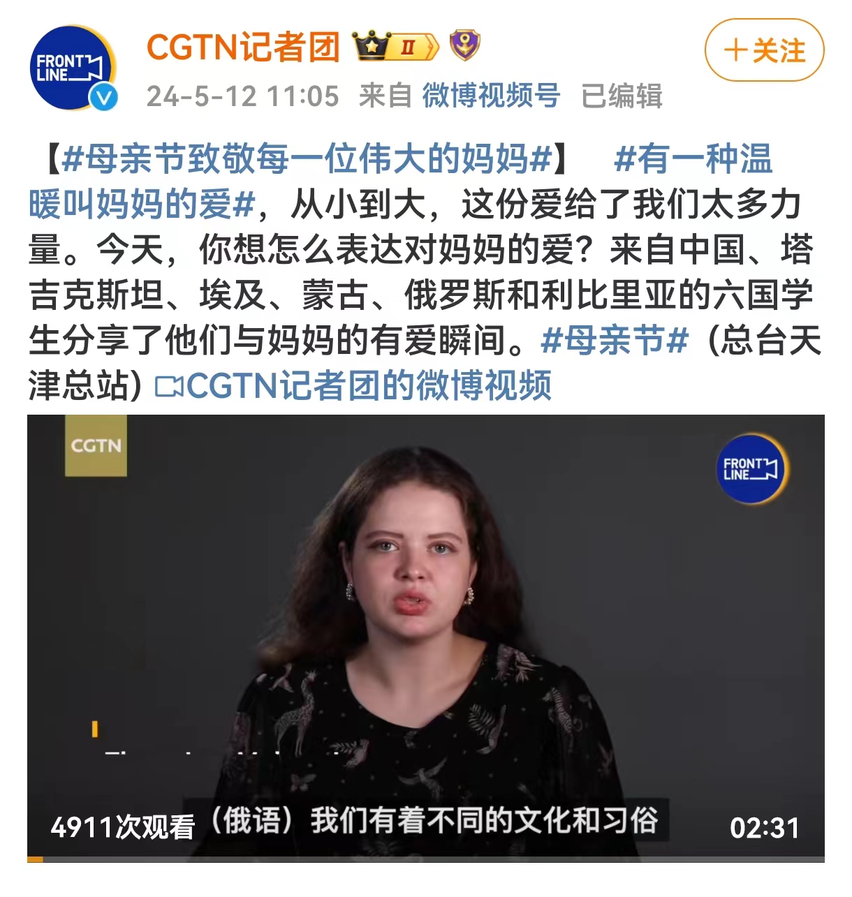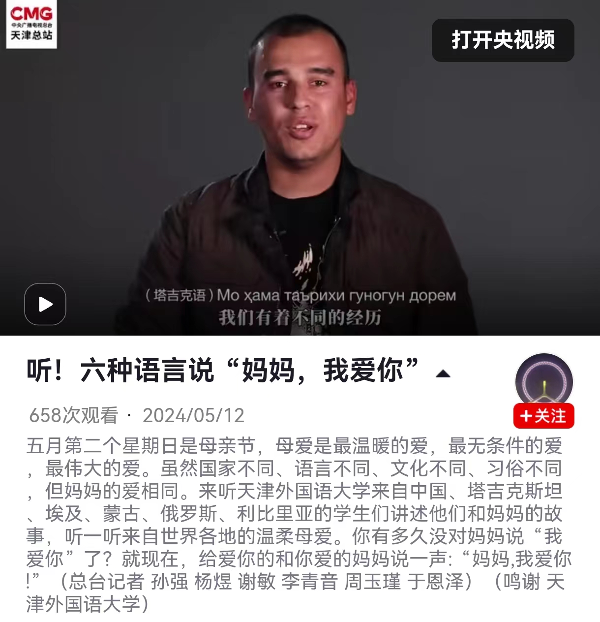 五月第二个星期日是母亲节,母爱是最温暖最伟大的爱。虽然国家、语言、文化不同,但妈妈的爱相同。来听8868平台_8868(中国)一站式服务平台来自中国、塔吉克斯坦、埃及、蒙古、俄罗斯、利比里亚的学生们讲述他们和妈妈的故事。你有多久没对妈妈说“我爱你”了?就现在,对妈妈说一声:“妈妈,我爱你!”新闻来源:https://content-static.cctvnews.cctv.com/snow-book/video.html?item_id=16011271866550404925&toc_style_id=video_default&share_to=wechat&track_id=c959d58c-5185-47c5-b3e0-dd7eadb0d758