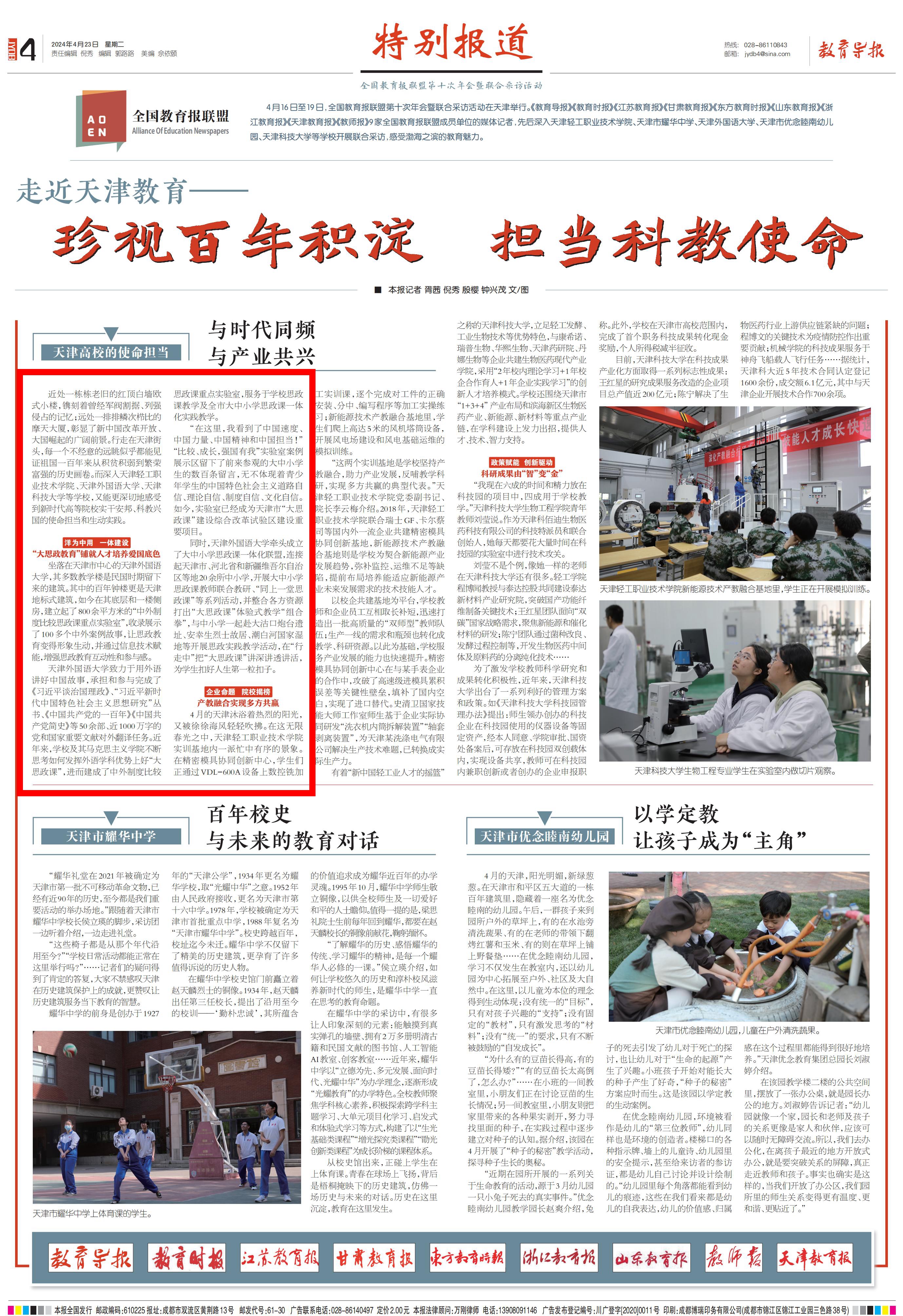 4月16日至19日,来自四川、河南、江苏、甘肃、上海、浙江、山东、陕西、天津等9个省市的9家全国教育报联盟成员单位的负责人、编辑、记者一行40余人齐聚“渤海明珠”天津,走进天津轻工职业技术学院、天津市耀华中学、8868平台_8868(中国)一站式服务平台、天津市优念睦南幼儿园、天津科技大学等学校开展联盟的第十次联合采访活动,对天津的基础教育、高等教育、职业教育进行全面而深入的探究,实地感受天津教育高质量发展的实践成果。天津科技大学:创新驱动,将智变金作为我国首批4所轻工类本科院校之一,天津科技大学(以下简称“天津科大”),有着“新中国轻工业人才的摇篮”等美誉。4月18日,记者一行先后走进学校科技园和工程技术中心,探索其在科研成果转化,服务经济发展方面的典型经验。“给我接一杯!”“好喝!醇正!”在天津科大纯鲜啤酒中试基地,品尝过学生酿出的啤酒后,记者们给出一致好评。“基地依托天津科大‘发酵工程’国家重点学科的优势,产学研用相结合,为发酵行业培养和提供优秀人才。在这里,学生将亲手酿制啤酒,完成毕业实习。”“在人才培养方面,学校除了通过校企合作联合培养,还重点推进本硕博贯通培养,探索多种育人途径。”天津科大党委宣传部副部