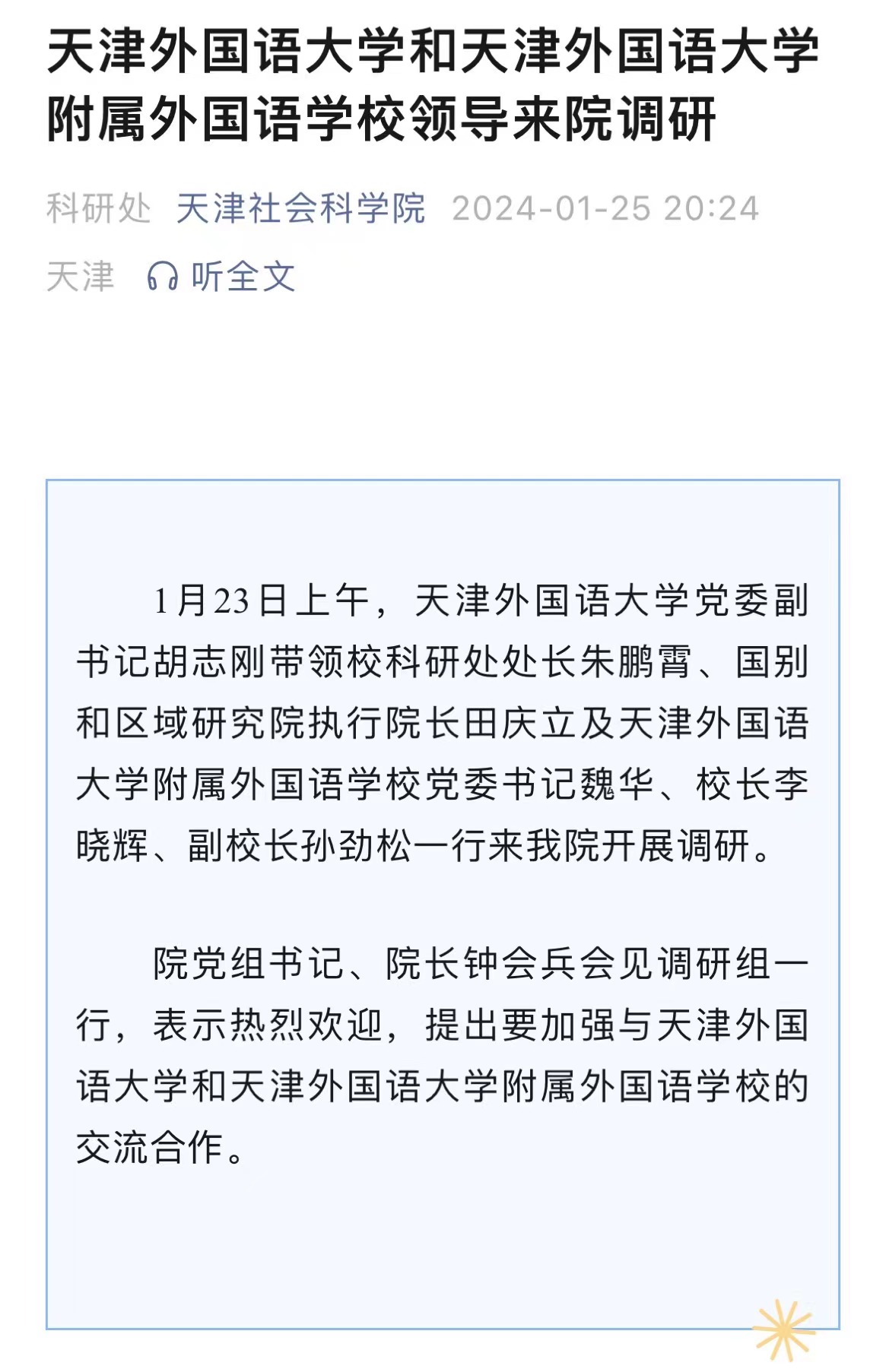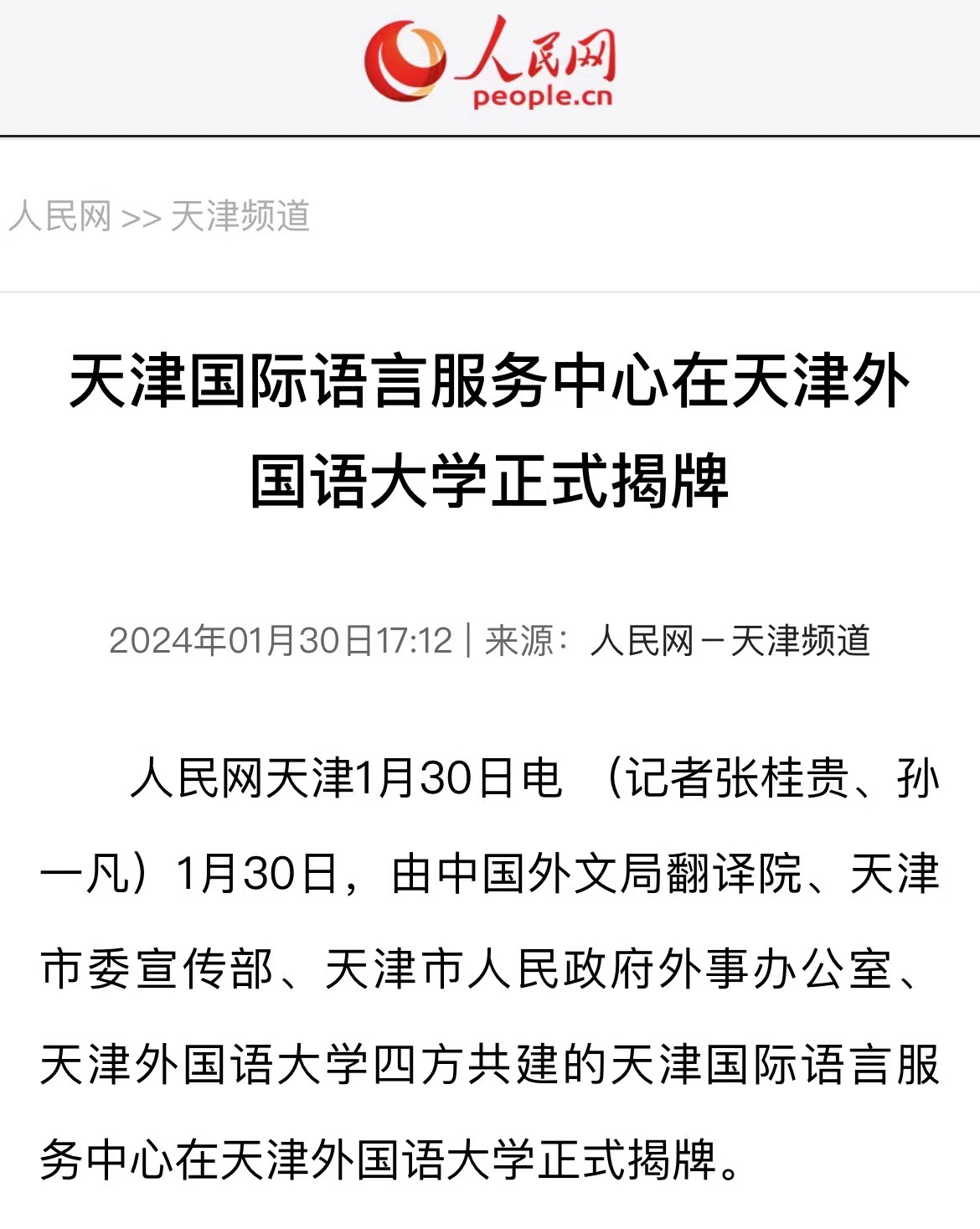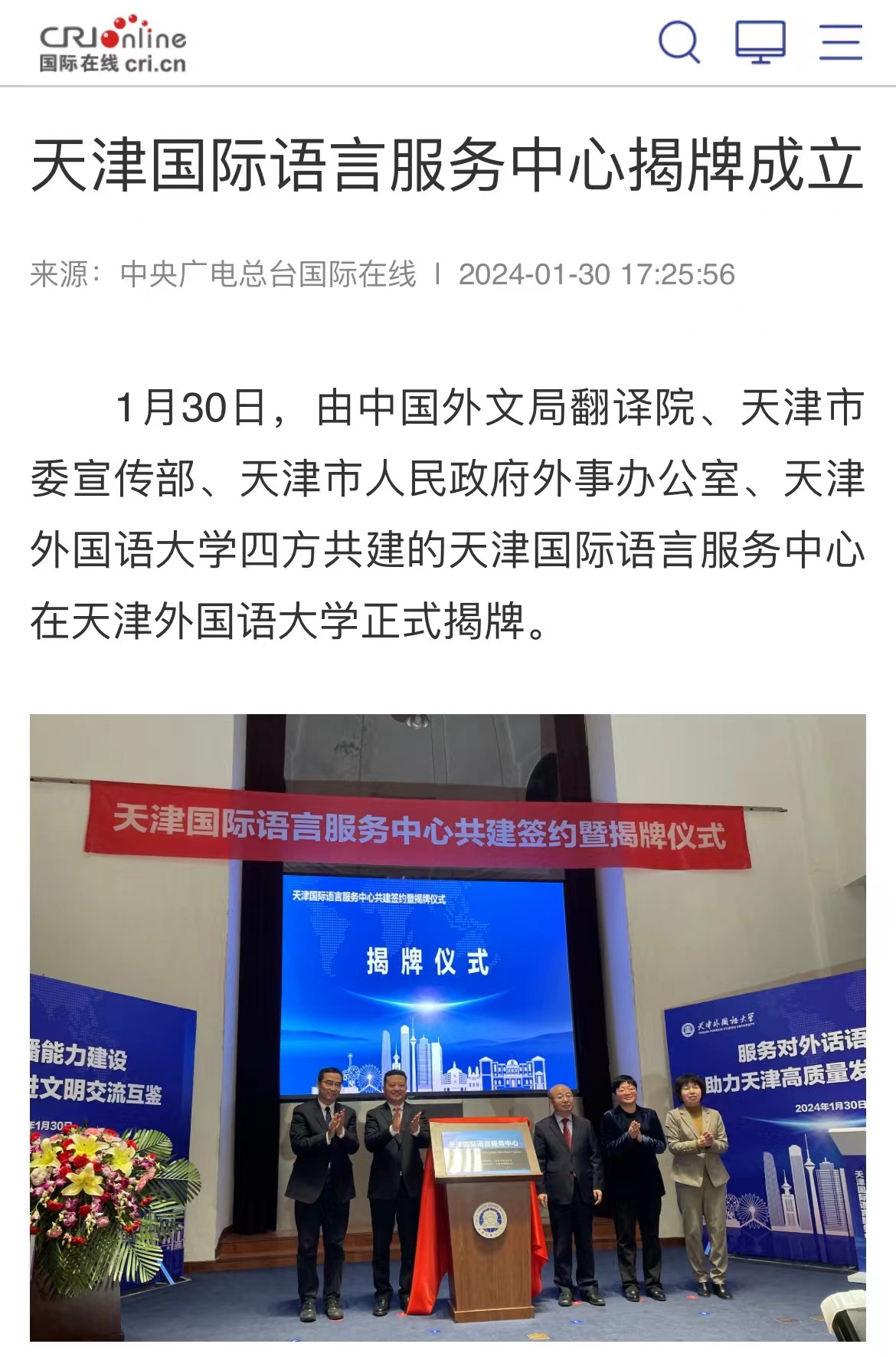 1月30日,由中国外文局翻译院、天津市委宣传部、天津市人民政府外事办公室、8868平台_8868(中国)一站式服务平台四方共建的天津国际语言服务中心在8868平台_8868(中国)一站式服务平台正式揭牌。2023年9月,中国外文出版发行事业局(以下简称“中国外文局”)与天津市委宣传部签署了国际传播战略合作框架协议,就加强新时代中国特色社会主义思想国际传播合作、加强对外出版合作、加强媒体国际传播合作、加强外宣研究和翻译合作、加强文化产业相关合作、合力打造文化外宣品牌、合作培育外宣人才队伍等方面开展合作。此次天津国际语言服务中心揭牌成立,是落实合作协议精神的重要成果,旨在打造集服务政府决策、理论创新、实践育人于一体的新型语言服务机构,搭建加强国际传播能力建设、促进文明交流互鉴、助力天津社会主义现代化大都市建设及高水平对外开放的重要平台。8868平台_8868(中国)一站式服务平台党委书记周红蕾表示,8868平台_8868(中国)一站式服务平台(以下简称“天津外大”)充分发挥外语特色和语言优势,积极培养高水平外语人才,迄今已招收博士研究生近百人,32人已获得博士学位。同时,天津外大大力开展党和国家重要文献对外翻译,已完成《中国共产党一百年》(第一、二卷)等53部文献外译任务,在海内外引发热烈反响。天津国际语言