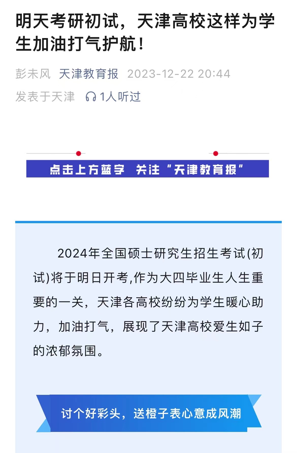 2024年全国硕士研究生招生考试(初试)将于明日开考,作为大四毕业生人生重要的一关,天津各高校纷纷为学生暖心助力,加油打气,展现了天津高校爱生如子的浓郁氛围。 讨个好彩头,送橙子表心意成风潮 记者发现,给考生送橙子是许多高校向学生表达心意的举措。天津工业大学纺织科学与工程学院为坚定学生的备考信心,缓解考试压力,传递温暖力量,给考研学子送水果,以“心想事‘橙’,一战‘橙’硕”之意预祝考研学子们成功“上岸”。天津理工大学后勤管理处联合各服务企业为全校3000多名考研学生免费赠送水果,每人一个橙子一根香蕉,寓意“心想事‘橙’、为你‘蕉’傲”。天津财经大学食堂考研日当天有免费橙子发放,祝福考生们心想事“橙”。 天津科技大学化工与材料学院的第一届“暖冬‘果’然有你”水果文化节背后则有一个暖心故事。12月中旬,学院了解到,一名经济困难学生家里以种植橙子为唯一收入来源,但今年面临橙子大面积滞销的困境,造成生活难上加难。学院领导第一时间决定面向该生家庭进行采购,将助困与助农紧密结合,组织策划第一届水果文化节。化工学院为每一位师生准备一份水果礼包,并精心制作了“苹”安上岸、一战“橙”硕、马到“橙”功、“
