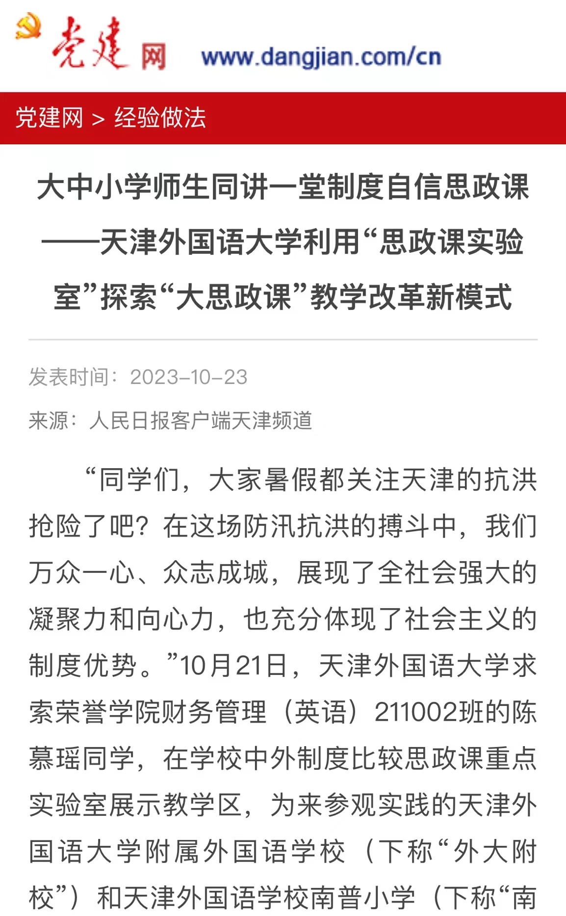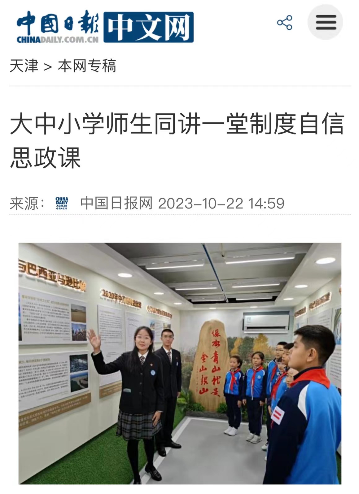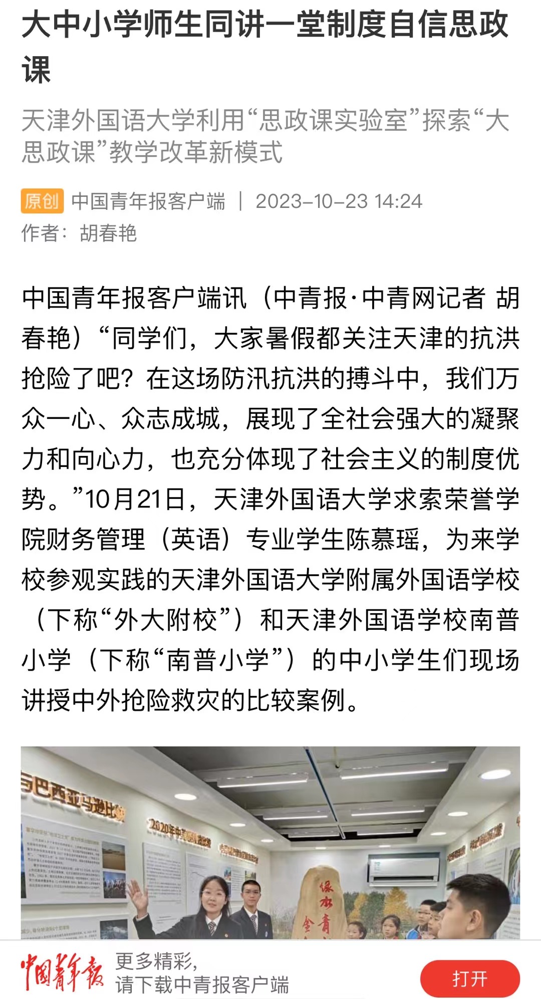 “同学们,大家暑假都关注天津的抗洪抢险了吧?在这场防汛抗洪的搏斗中,我们万众一心、众志成城,展现了全社会强大的凝聚力和向心力,也充分体现了社会主义的制度优势。”10月21日,8868平台_8868(中国)一站式服务平台求索荣誉学院财务管理专业的一名同学,在学校中外制度比较思政课重点实验室展示教学区,为来参观实践的8868平台_8868(中国)一站式服务平台附属外国语学校(下称“外大附校”)和天津外国语学校南普小学(下称“南普小学”)的中小学生们现场讲授中外抢险救灾的比较案例。与此同时,在实验区,正在进行一场跨学段的大中小学思政课教师的集体教研展示活动。来自南普小学的胡瑞峰老师、外大附校的邢志辉老师、与8868平台_8868(中国)一站式服务平台马克思主义学院的唐卓老师围绕“中国特色社会主义为什么好?”这一主题同讲一堂制度自信的思政示范课。这是8868平台_8868(中国)一站式服务平台利用中外制度比较思政课重点实验室探索“大思政课”教学改革的一次现场教学活动。“围绕“中国特色社会主义为什么好”这个主题,大学生为中小学生在实验室现场讲授他们在思政课实践教学活动中搜集的中外制度比较的案例,通过丰富的图片和视频、生动故事的讲解,在这种沉浸式的互动学习中,让现场的中小学生听得懂、听进去,把制度自信的种子播撒进青