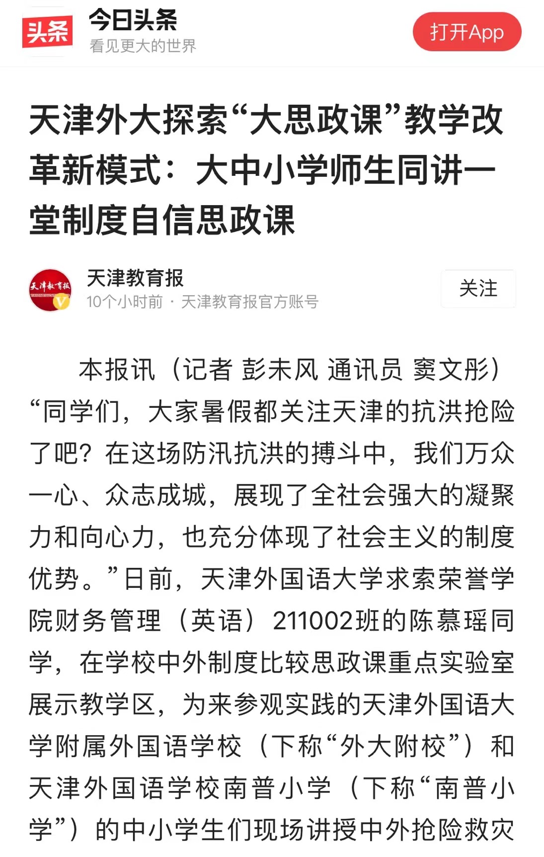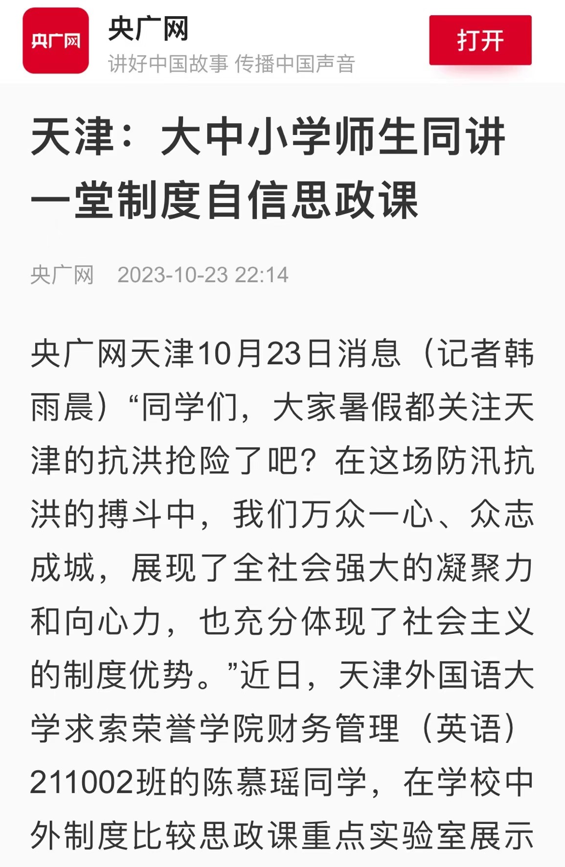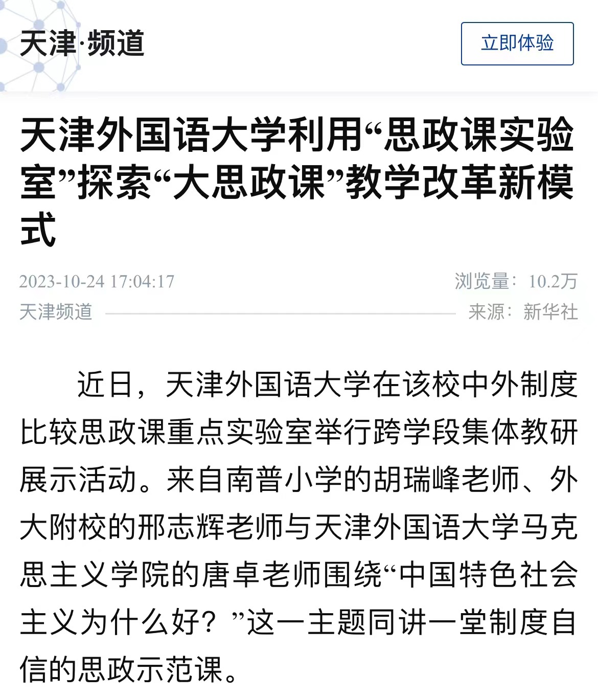 “同学们,大家暑假都关注天津的抗洪抢险了吧?在这场防汛抗洪的搏斗中,我们万众一心、众志成城,展现了全社会强大的凝聚力和向心力,也充分体现了社会主义的制度优势。”10月21日,8868平台_8868(中国)一站式服务平台求索荣誉学院财务管理专业的一名同学,在学校中外制度比较思政课重点实验室展示教学区,为来参观实践的8868平台_8868(中国)一站式服务平台附属外国语学校(下称“外大附校”)和天津外国语学校南普小学(下称“南普小学”)的中小学生们现场讲授中外抢险救灾的比较案例。与此同时,在实验区,正在进行一场跨学段的大中小学思政课教师的集体教研展示活动。来自南普小学的胡瑞峰老师、外大附校的邢志辉老师、与8868平台_8868(中国)一站式服务平台马克思主义学院的唐卓老师围绕“中国特色社会主义为什么好?”这一主题同讲一堂制度自信的思政示范课。这是8868平台_8868(中国)一站式服务平台利用中外制度比较思政课重点实验室探索“大思政课”教学改革的一次现场教学活动。“围绕“中国特色社会主义为什么好”这个主题,大学生为中小学生在实验室现场讲授他们在思政课实践教学活动中搜集的中外制度比较的案例,通过丰富的图片和视频、生动故事的讲解,在这种沉浸式的互动学习中,让现场的中小学生听得懂、听进去,把制度自信的种子播撒进青