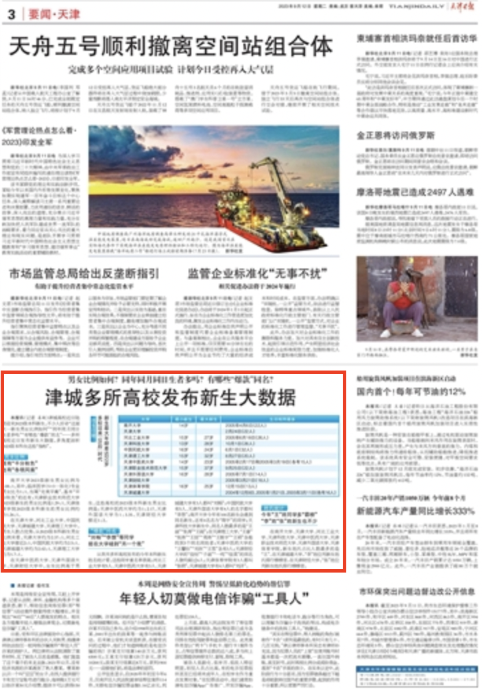 本报讯津城高校近日陆续迎来2023级本科新生,不少人好奇“这届大一新生男女比例如何”“同年同月同日生者多吗”“有哪些‘爆款’同名”……多所高校近日发布新生大数据,多角度剖析2023级本科生这些“指标”。男女比例既有“平分秋色”也有“各领风骚”南开大学2023级新生男女比例为1.08:1,其中,临床医学(5+3一体化)专业男女比为1:1,当属“完美平衡”。基本“平分秋色”的还有:天津职业技术师范大学2023级新生的男女比例是1.29:1,天津体育学院2023级本科新生的男女比例约为1.26:1。在天津大学、河北工业大学、中国民航大学、天津城建大学、天津理工大学中,男生人数占优势。从2023级本科新生男女比例来看,天津大学约为2.37:1,河北工业大学接近2:1,中国民航大学约为2.5:1,天津城建大学约为2.02:1,天津理工大学约为1.7:1。在天津中医药大学、8868平台_8868(中国)一站式服务平台、天津财经大学中,女生比例高于男生。这些高校的2023级本科新生男女比例是:天津中医药大学约为1:2.17,8868平台_8868(中国)一站式服务平台为1:3.35,天津财经大学接近1:2。“爆款”同名“刘畅”“李想”等同学能在大学碰到“另一