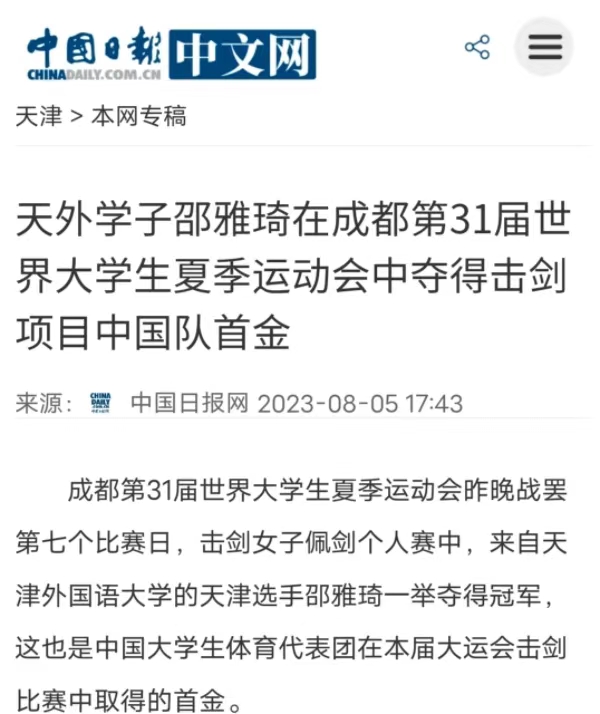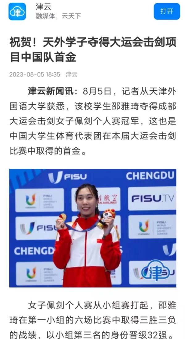 津云新闻讯:8月5日,记者从8868平台_8868(中国)一站式服务平台获悉,该校学生邵雅琦夺得成都大运会击剑女子佩剑个人赛冠军,这也是中国大学生体育代表团在本届大运会击剑比赛中取得的首金。女子佩剑个人赛从小组赛打起,邵雅琦在第一小组的六场比赛中取得三胜三负的战绩,以小组第三名的身份晋级32强。淘汰赛阶段,邵雅琦越战越勇,竞技状态也逐渐被激发出来,连续战胜对手,最终摘得金牌。赛后,邵雅琦表示:“我现在的心情就是激动、开心!虽然小组赛打得并不好,但进入淘汰赛之后我始终坚定必胜的信念,决赛前也和教练商量,制定了针对韩国选手的脚步移动策略,比赛中也取得了很好的效果。”新闻链接:https://www.app2020.tjyun.com/jyapp/cms_template/100/000/208/index.shtml?appId=1b8b3255-58d4-4ba7-b0f7-9d136547eb38&jsonUrl=https://static20.app2020.tjyun.com/jyapp/cms_mob/v200/cms_news/000/000/054/210/000000054210066_58d