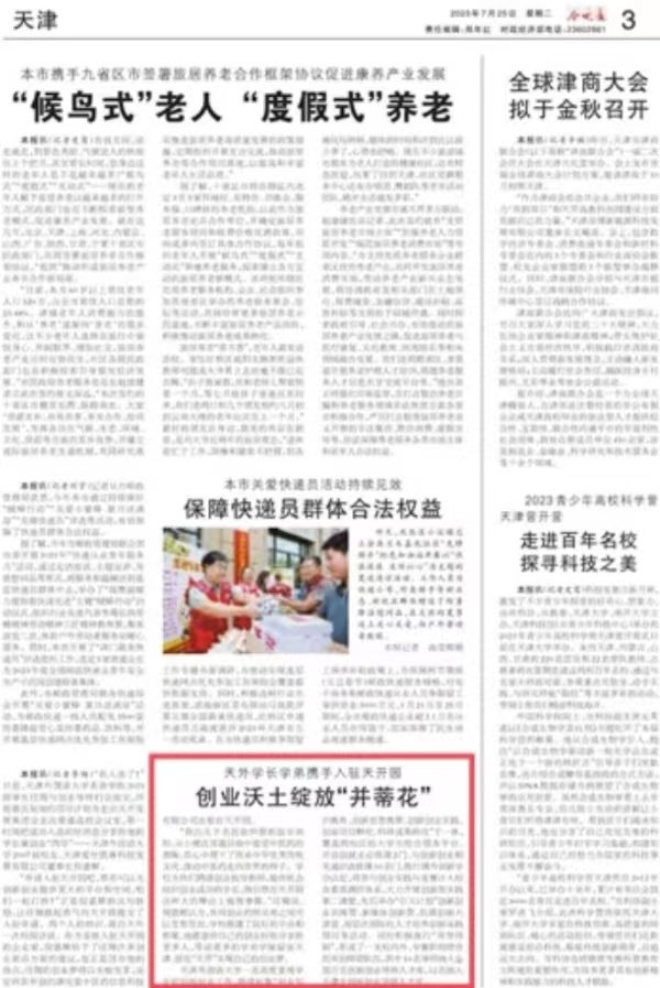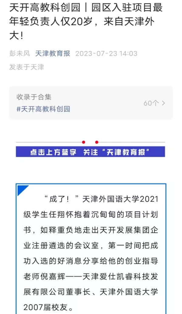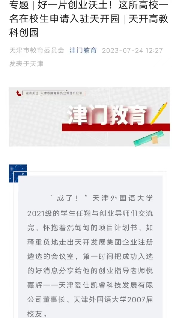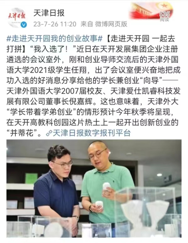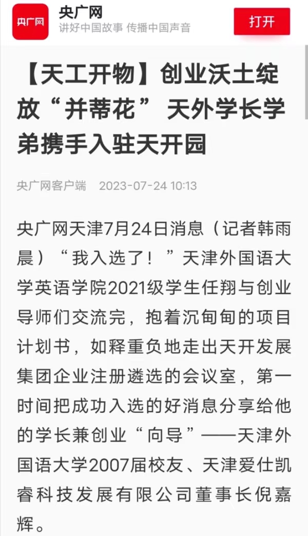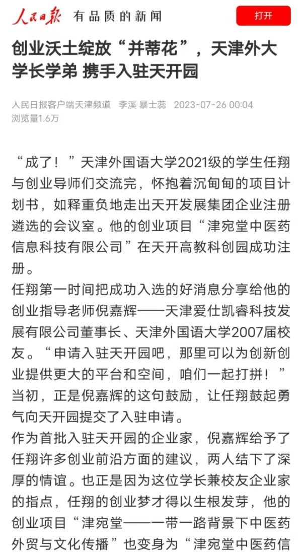 “我入选了!”近日在天开发展集团企业注册遴选的会议室外,刚和创业导师交流后的8868平台_8868(中国)一站式服务平台2021级学生任翔,出了会议室便兴奋地把成功入选的好消息分享给他的学长兼创业“向导”──8868平台_8868(中国)一站式服务平台2007届校友、天津爱仕凯睿科技发展有限公司董事长倪嘉辉。这也意味着,天津外大“学长带着学弟创业”的情形预计今年秋季将呈现,在天开高教科创园这片热土上一起开出创新创业的“并蒂花”。 “申请入驻天开园吧,那里可以为创新创业提供更大的平台和空间,咱们一起打拼!”任翔告诉记者,正是倪嘉辉的这句鼓励,使他鼓起勇气向天开园提交了入驻申请。“有了学长兼校友企业家的指点,我的创业梦得以生根发芽。”任翔说,他俩相识于8868平台_8868(中国)一站式服务平台里的一次访谈,当时作为天开园首批入驻企业家之一,倪嘉辉给了任翔许多创业的建议。也正由此,任翔决定将其所创的津宛堂中医药信息科技有限公司注册在天开园。“我生于名医张仲景的故乡南阳,从小便在耳濡目染中接受中医药的熏陶。学校为我们聘请创业指导教师、提供机会结识创业成功的学长,指导我在天开园这样的舞台上施展拳脚。”任翔说。倪嘉辉则表示,共同创业的师兄弟之间可以互帮互助,学校可以给予大家科研和人