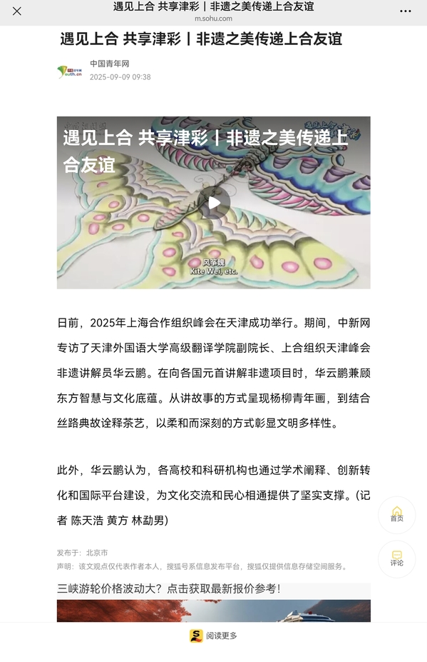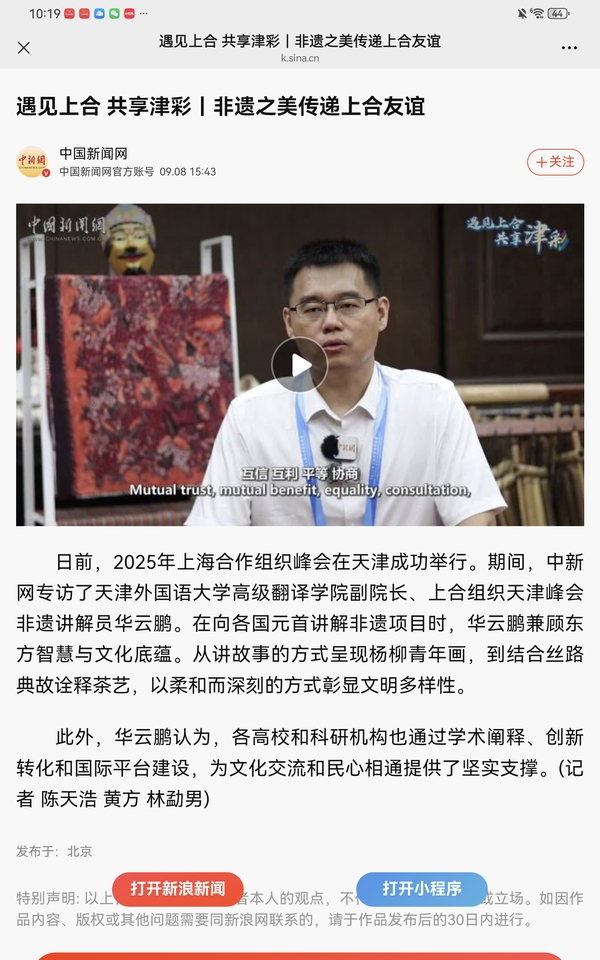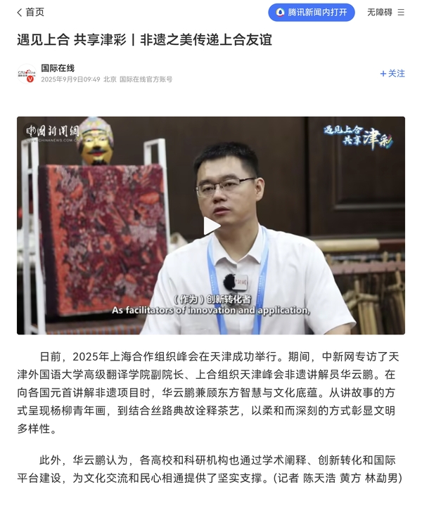 【相约上合】上合峰会期间,中新社专访了我校高级翻译学院副院长、上合组织天津峰会非遗讲解员华云鹏。报道通过中新社全媒体平台发布,并由中央网信办向全网推送。报道指出,在向各国元首讲解非遗项目时,华云鹏兼顾东方智慧与文化底蕴。从讲故事的方式呈现杨柳青年画,到结合丝路典故诠释茶艺,以柔和而深刻的方式彰显文明多样性。他认为,各高校和科研机构也通过学术阐释、创新转化和国际平台建设,为文化交流和民心相通提供了坚实支撑。全文转载如下:日前,2025年上海合作组织峰会在天津成功举行。期间,中新网专访了8868平台_8868(中国)一站式服务平台高级翻译学院副院长、上合组织天津峰会非遗讲解员华云鹏。在向各国元首讲解非遗项目时,华云鹏兼顾东方智